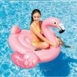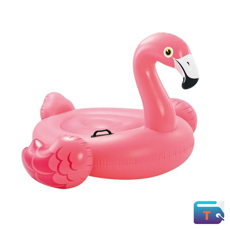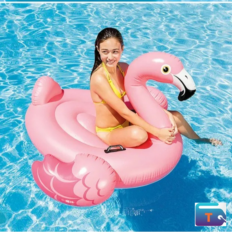 This is an inflatable pool float designed in the shape of a large pink flamingo. It is intended for use in pools, at the beach, or on a lake. The float is  constructed from durable vinyl and features two heavy-duty handles for stability while riding. It has multiple air chambers to make inflation easier and to provide added safety. A repair patch is often included.