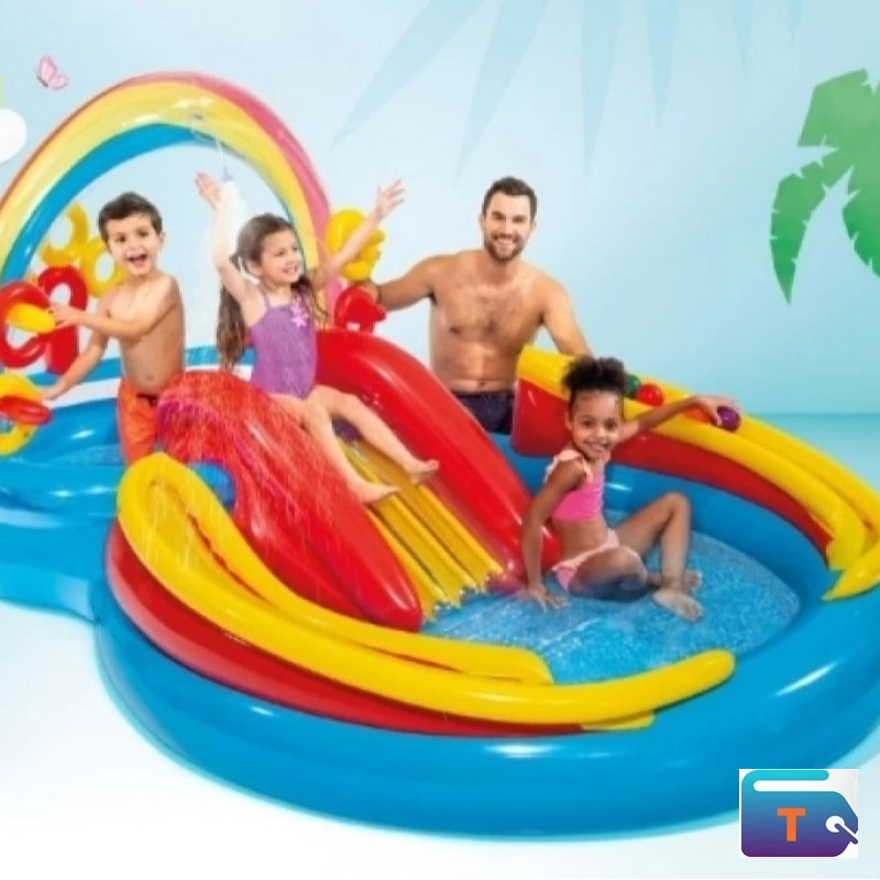 This is the Intex Rainbow Ring Play Center, an inflatable pool and water play area for children that can be set up in a backyard. It is constructed from durable vinyl and is designed for kids ages 2 and up.
