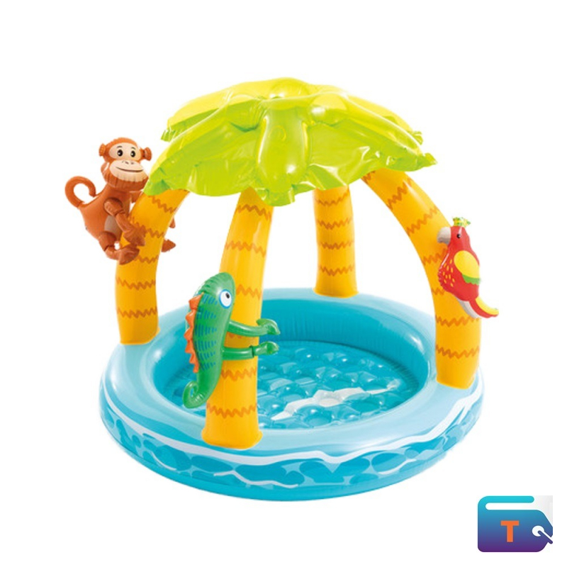 This the Intex Tropical Island Baby Pool, a round inflatable pool designed for toddlers aged 1 to 3 years old. It has a built-in palm tree canopy that provides sun protection, and a soft, inflatable floor for comfort and safety. The pool has a vibrant tropical or jungle theme and comes with detachable inflatable toys, including a monkey, iguana, and parrot, to encourage imaginative play.