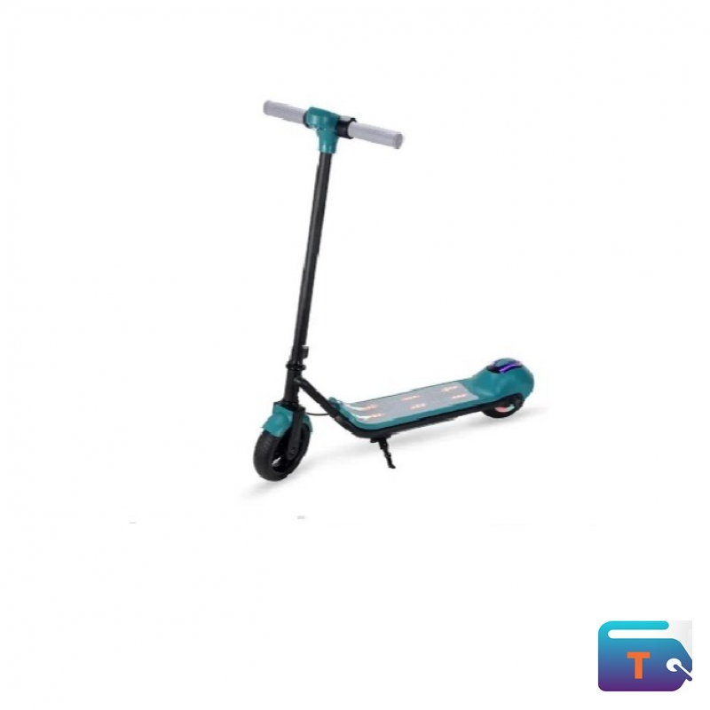 This is a kids' electric scooter with a teal and black color scheme. It is powered by a 110W motor and a 25.2V 2.5Ah lithium battery, giving it a range of 5โ8 km per charge. The scooter has 6.5-inch solid rubber tires that do not require inflation, which helps provide a smooth ride. It also features a digital display on the handlebar that shows speed, mode, and battery life, as well as colorful LED lights on the deck for added visibility and fun. The scooter weighs approximately 7 kg and has a foldable design for easy storage and transport. It has a finger-controlled throttle and brake. It is recommended for children between the ages of 6 and 14 years old