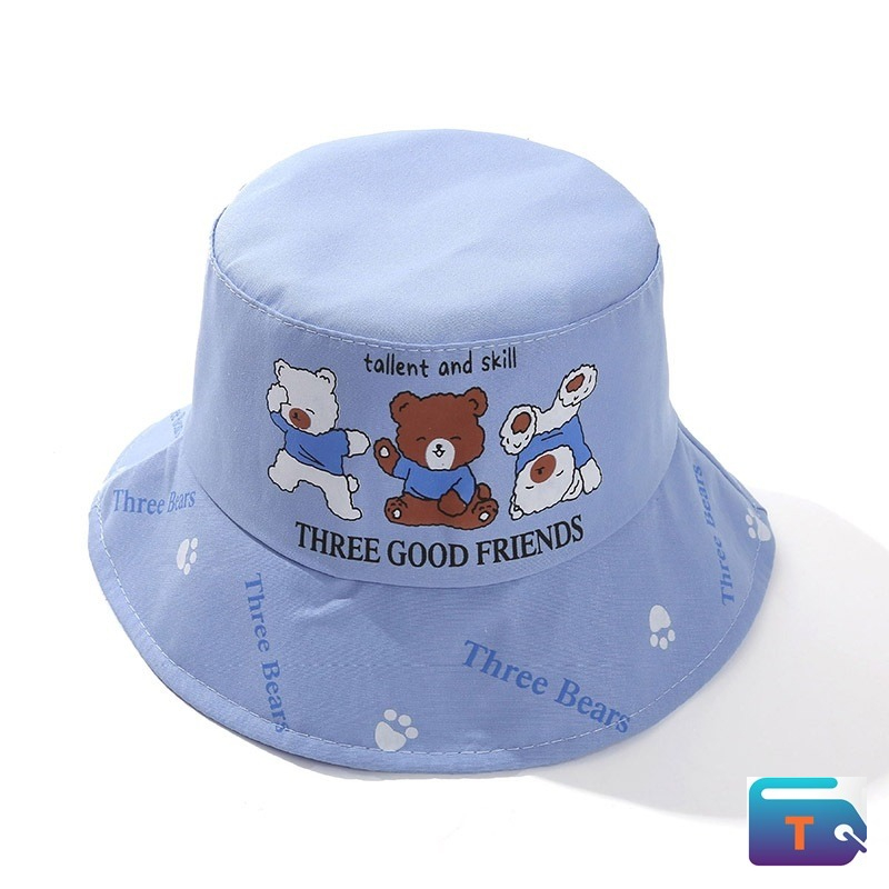 This is a light blue bucket hat, for children, with a cartoon bear theme. The hat is decorated with three cartoon bears on the side, with a small version of one of the bears and a single acorn scattered around the brim. The text "lent and skill," "THREE GOOD FRIENDS," and "Three Bears" is also printed on the hat. This hat comes in different colors namely black, brown, beige and green.