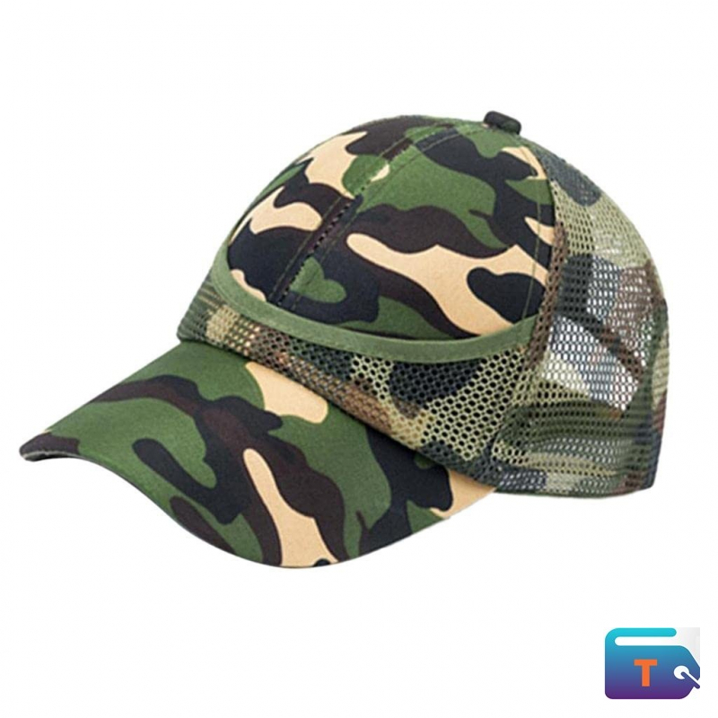 This is a kids' army camouflage cap with a classic curved brim. The front of the cap features a green, brown, and white camouflage pattern. The back of the cap is made of a breathable mesh material, which helps with airflow. The cap is a baseball or trucker style and often has an adjustable strap, such as a snapback or velcro closure, for a customizable fit.