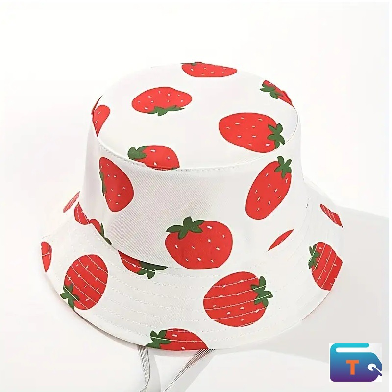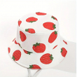 A white bucket hat with a strawberry print. The hat features a wide brim and a repeating pattern of red strawberries and green stems on a white background. It is designed with a chin strap and a toggle for a secure, adjustable fit. This style of hat is designed to provide sun protection.