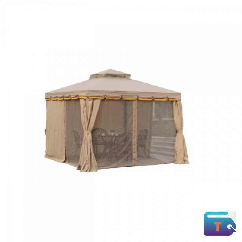 This is a beige outdoor soft-top gazebo or canopy tent. It is designed to create an extra room or sheltered space in a backyard, patio, or garden for relaxation, dining, or outdoor events.
