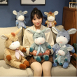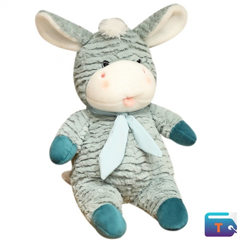 This item is a plush donkey stuffed animal. It has a soft, fluffy texture and is described as being made from materials such as super-soft cotton or polyester fillings. The donkey is brown with a white snout and inner ears, and it wears a pink and white striped tie. This can be a gift for children and adults and is suitable for various uses, including as a plaything, a cuddle companion, or a decorative pillow. This comes in so many different colors.