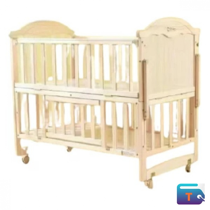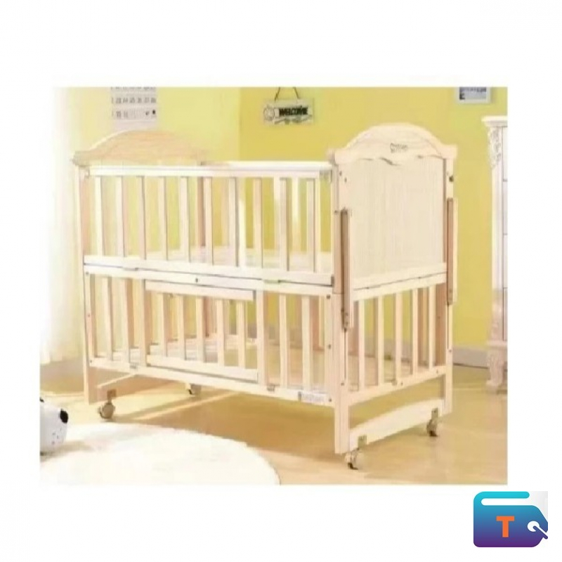 baby . It is made of pinewood with a natural wood color, ensuring safety and durability. It features a modern design and is suitable for children aged 0-12 years. It has wheels to help when moving it.
