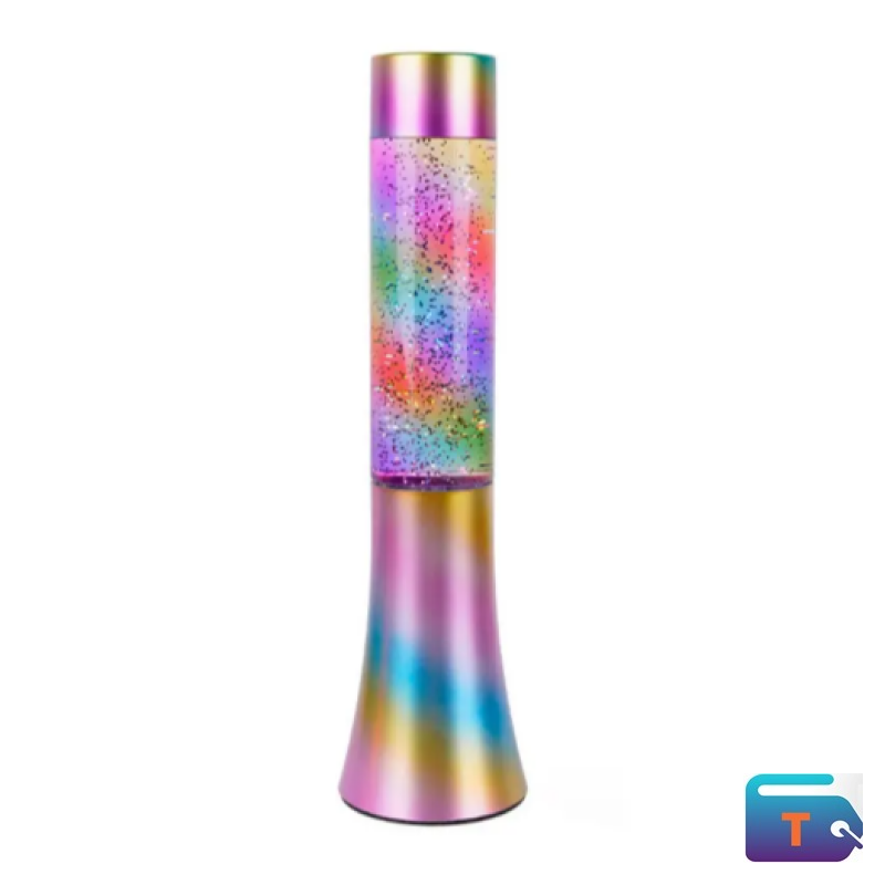 Bright Rainbow Color Appearance and Unique Shape This water lamp has a unique tower shape which is about 13 ins (33cm) tall with a red and golden plated base and rainbow color glass which make this lamp to be a beautiful artistic decoration for a room even when it is turned off.