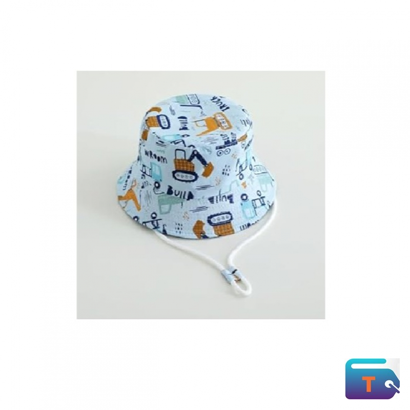 A reversible bucket hat for children, with a construction theme. The hat is a light mint green color and is decorated with a pattern of construction vehicles such as excavators and dump trucks. It also has text printed on it that includes words like "WROOM" and "BUILD". The hat is designed with a wide brim to offer sun protection.