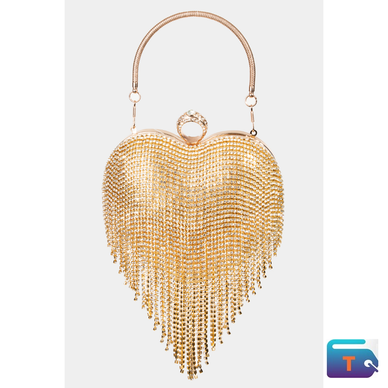 This bag introduces a unique rhinestone fringe heart style. Celebrate individual style with this versatile, eye-catching addition.