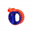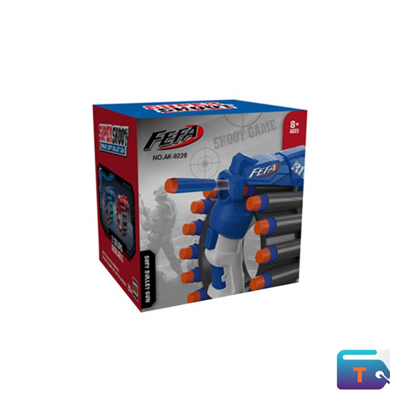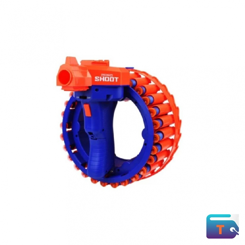 This is a  soft bullet gun. It is designed for ages 8 and up. This toy gun is a manual spring-action blaster that does not require batteries. It features a rotating ring-style holder for bullets and is typically made with soft foam bullets with rubber tips for safety. The gun is intended for shooting games and can be used for both indoor and outdoor play.