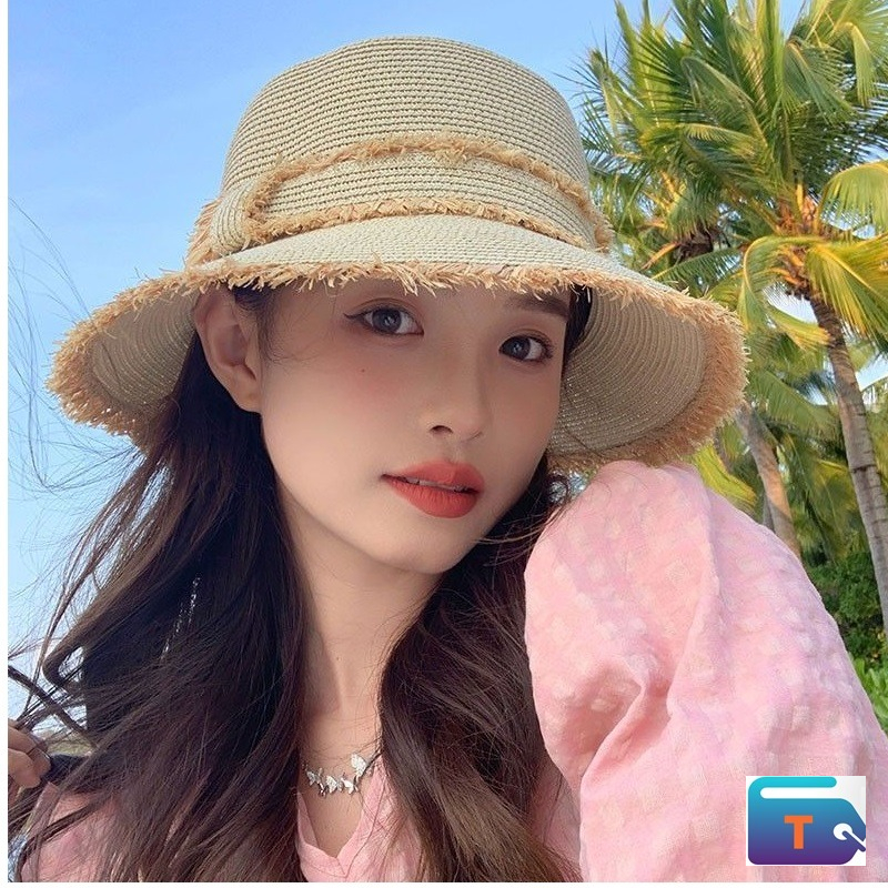 This is a straw bucket hat with a round, flat crown and a downward-sloping brim. It is made from woven straw and has a neutral color. The brim features a frayed edge, which gives the hat a rustic or bohemian feel. A braided band with a fringed texture wraps around the base of the crown. This style is used as a sun hat for beach vacations or other warm-weather activities. This comes in many other colors.