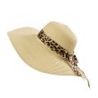 This is a wide-brimmed straw sun hat, often referred to as a floppy hat or beach hat. It is made from woven straw material and features a band with a leopard print design. The wide brim provides sun protection for the face and neck. It has a foldable and packable design, making them suitable for travel. The leopard print band can be a fixed ribbon or a removable scarf, and it sometimes includes a bow. This comes in different colors.