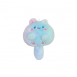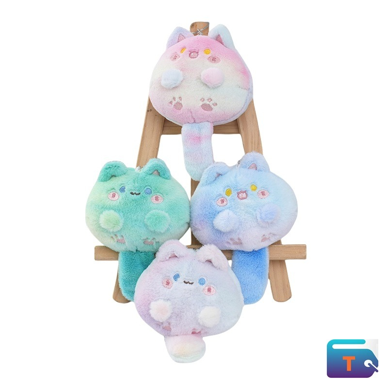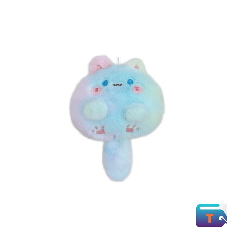 This is a stuffed animal cat keychain. It is a plush toy that is designed in a cute, cartoon-like style. The keychain has an oversized head and a smaller body, and is made of soft, plush material. The colors are pastel, including pink, blue, and yellow. It may also have a squeaker inside its tail. This type of keychain is a popular accessory for bags or backpacks.