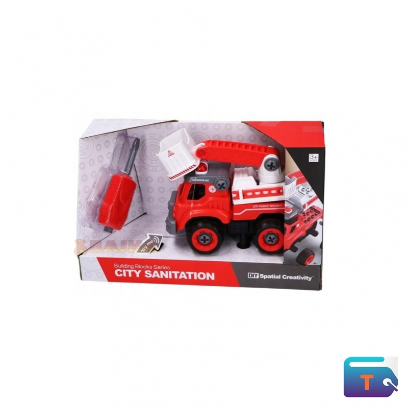 The toy is a DIY, take-apart fire truck. This educational toy is designed to be assembled and disassembled, which helps to develop a child's fine motor skills, logical thinking, and creativity.