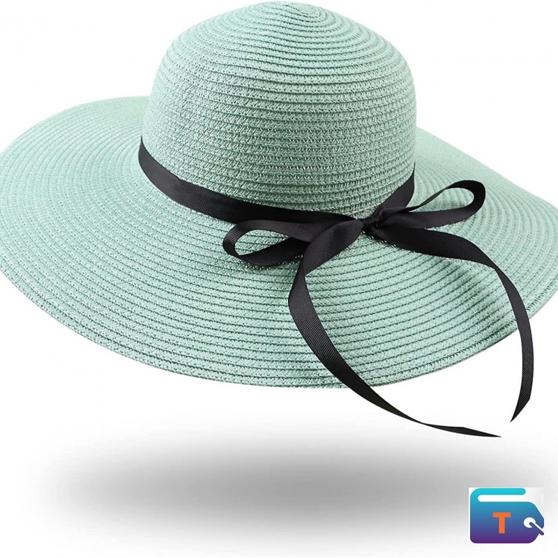This is a mint green, wide-brimmed straw hat with a black ribbon band and bow. It is a sun hat or beach hat, and is made from paper straw, making them lightweight and breathable. The hat also has a small, light-colored cloud-shaped pin or charm on the brim. This hat comes in different colors.